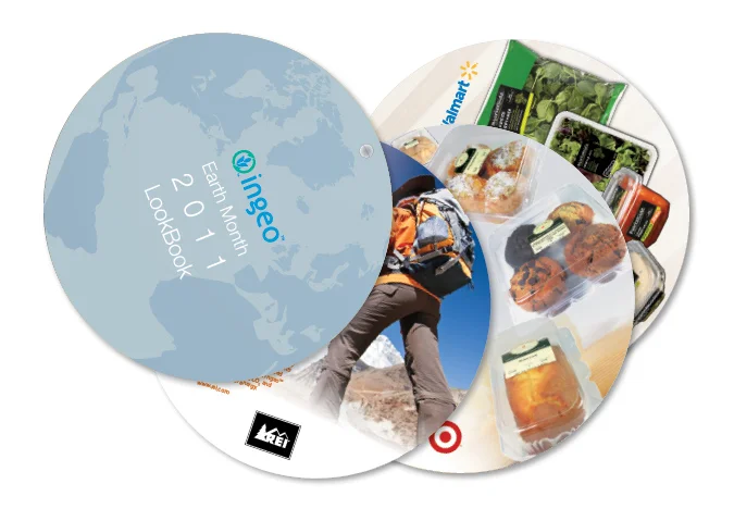 I was asked to make a unique handout that would be distributed to brand managers around the world to highlight the flexibility of Ingeo biopolymer. The biopolymer can be used to make compostable plastic goods ranging from food packaging to cell phones, so this lookbook had to quickly speak to Ingeo's multitude of uses. The lookbook featured examples of products from over 50 different partners including many Fortune 500 companies. Both a digital and print version were made.